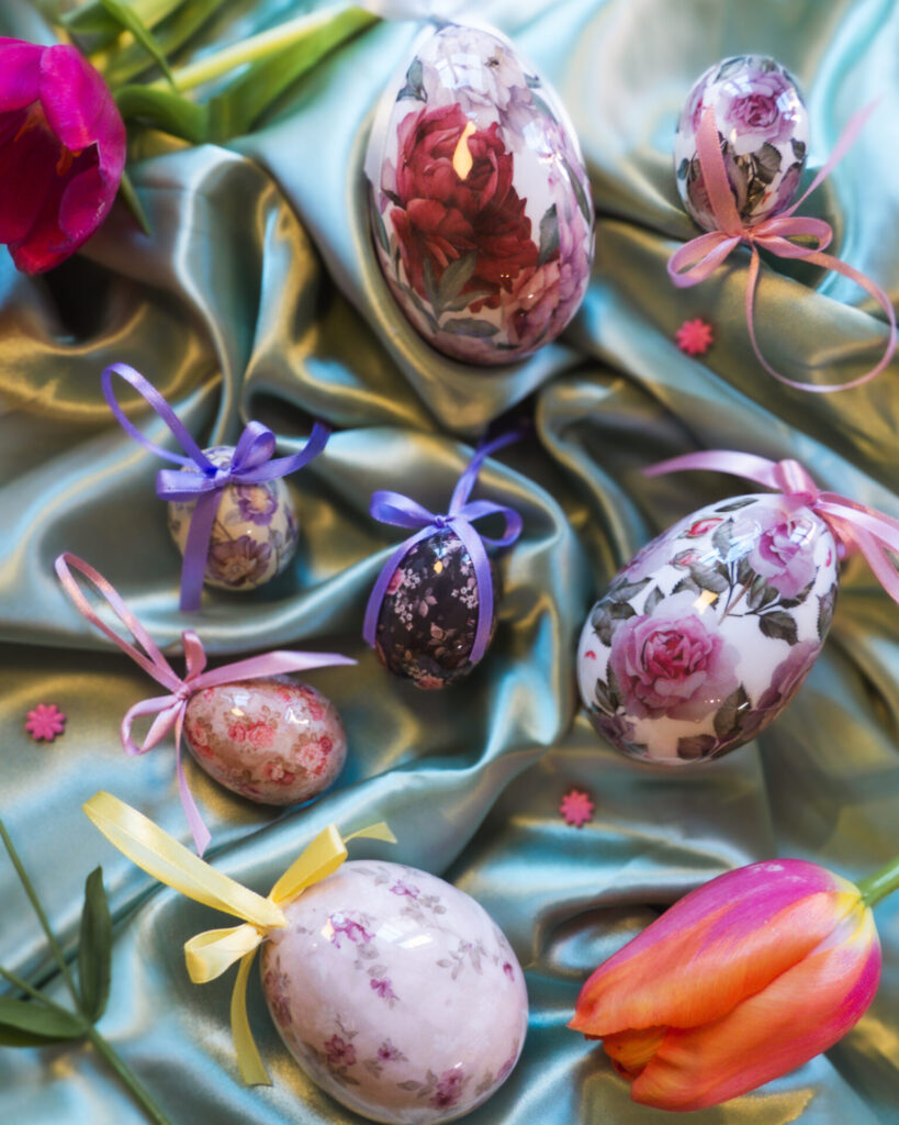 Coffret d’oeufs décoratifs pour Pâques à suspendre dans un style victorien et printanier.